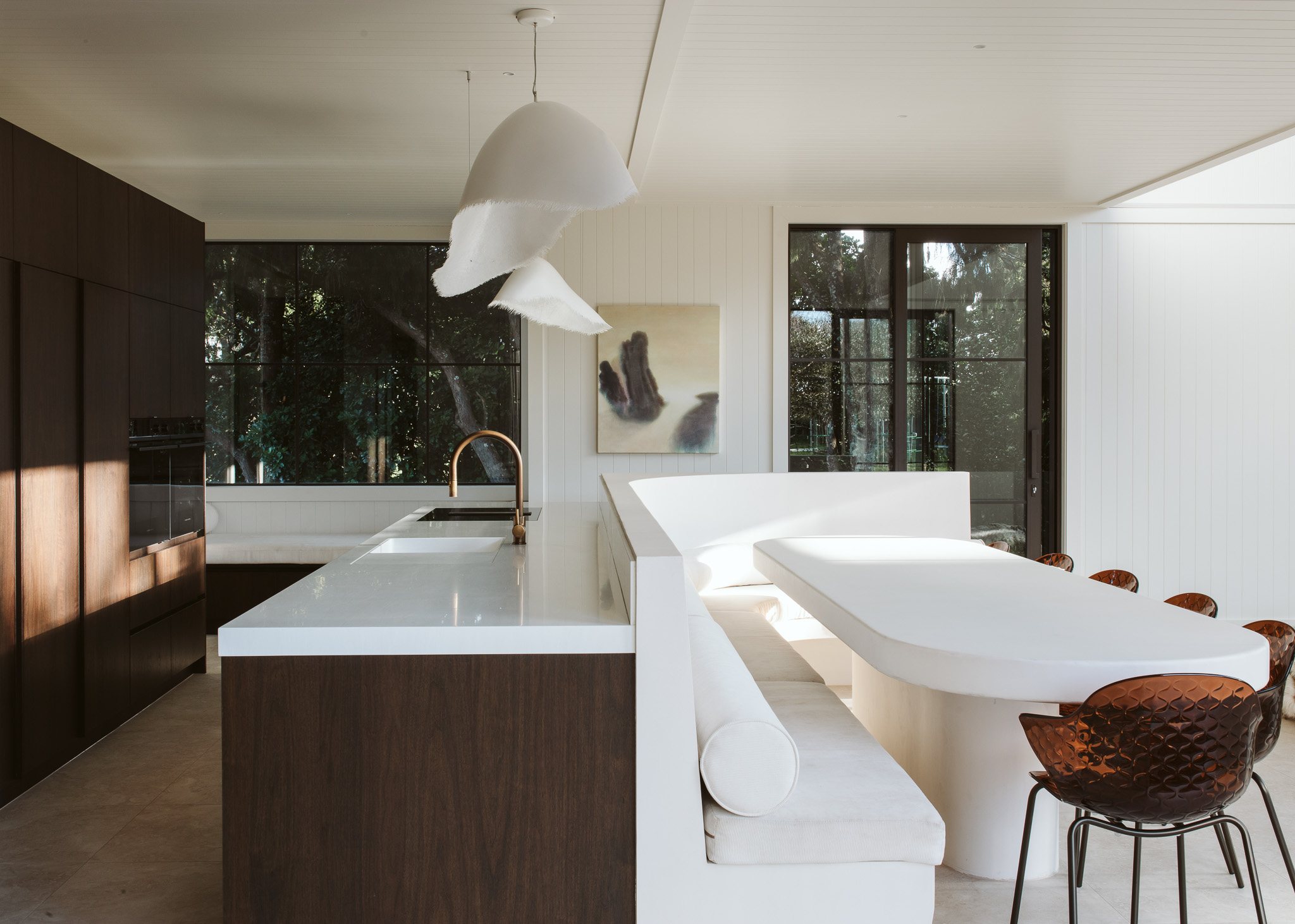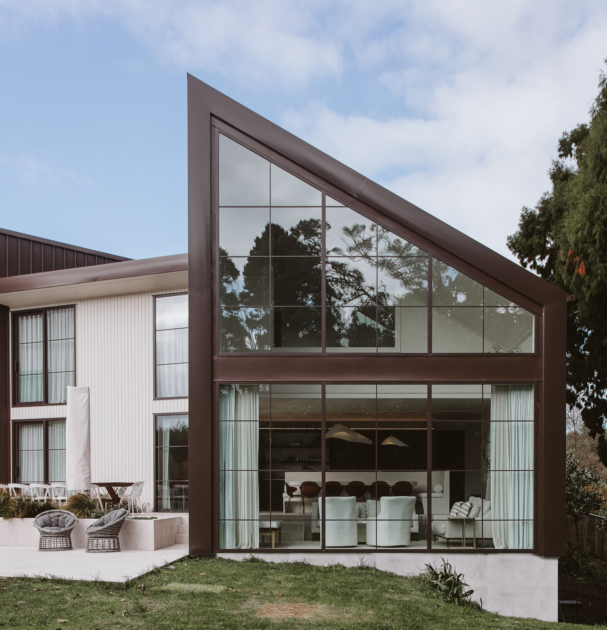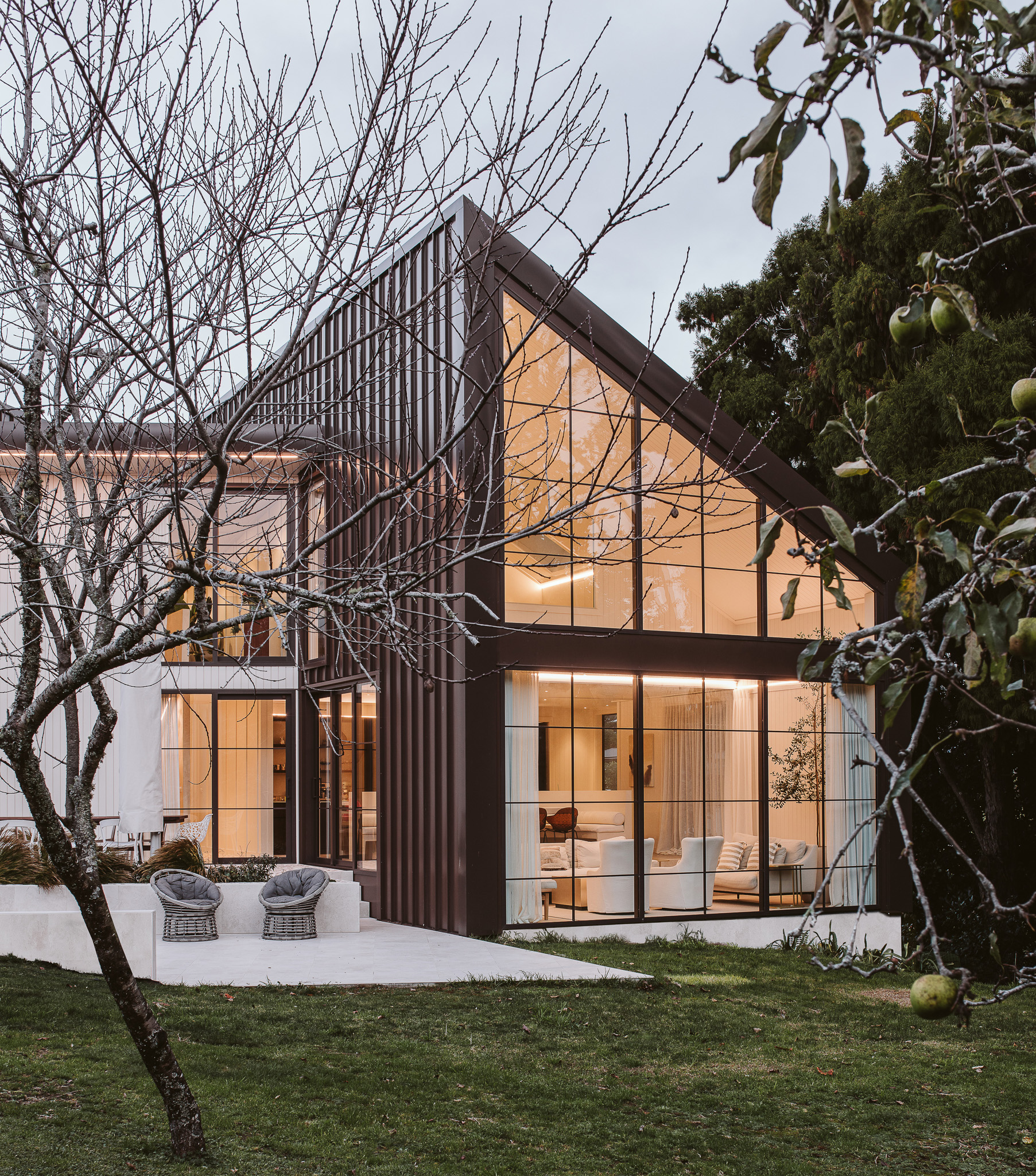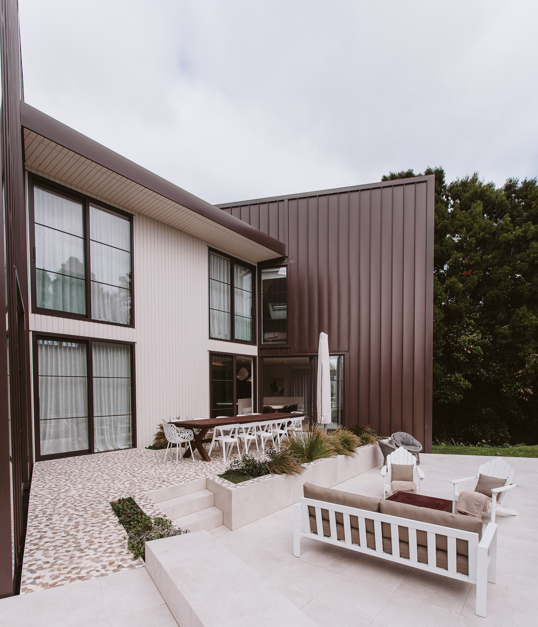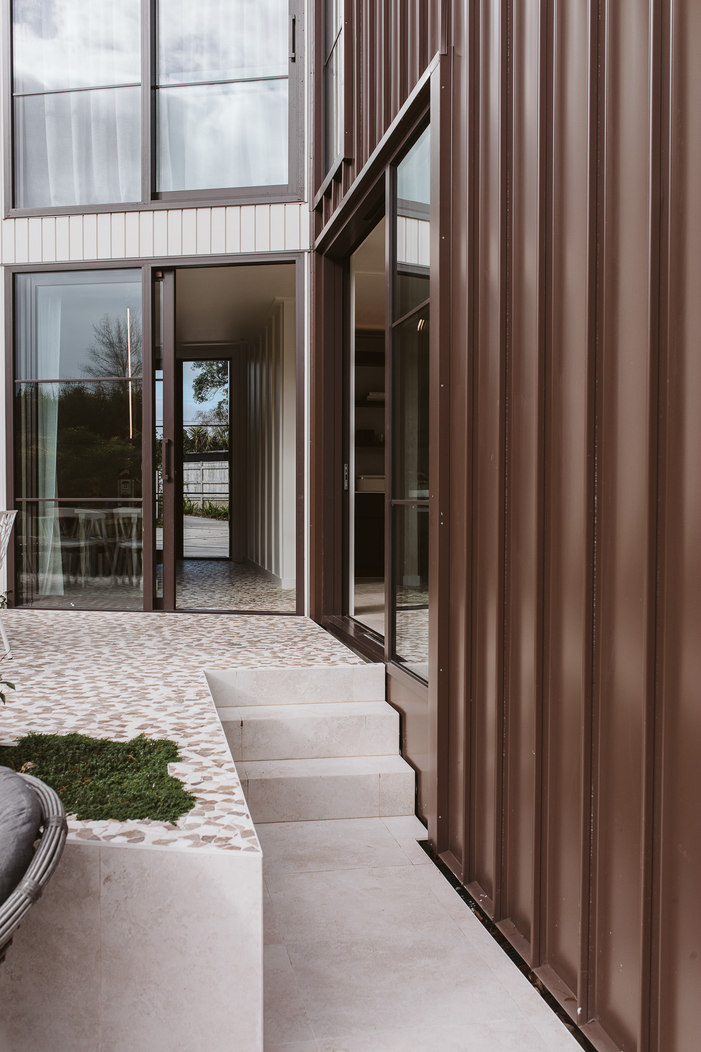 Clad in a deep-brown steel that suits the semi-rural surrounds, and shiplap weatherboards, the exterior language also translates to the indoors to blur what is in and what is out.