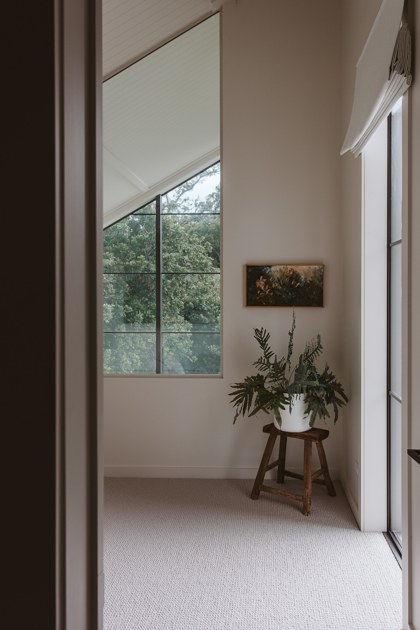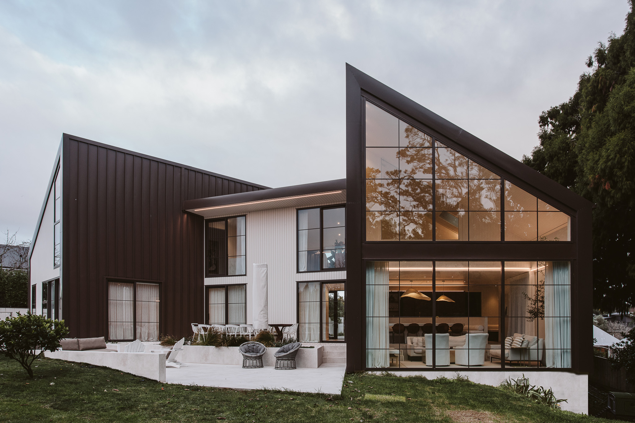 The house does not have a large footprint but utilises inherent volumes that sweep up into the triangular rooflines, which provides the sense of spaciousness and give the leafy surrounds an almost all-encompassing impression via strategic glazing.